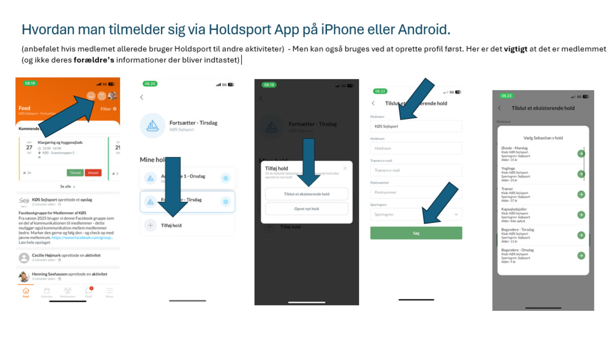 Benytter du allerede Holdsport som klubsystem for andre aktiviteter for medlemmet (her den der går på holdet) - så kan du opskrive dig via den profil. Du skal søge på "Klub": "KØS Sejlsport" og derefter finde det pågældende hold. (se nedenfor)